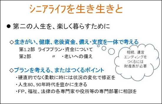以上、今回の講座では、第二の人生を楽しく暮らすためのポイントについて話されました。第1、2回ではライフプラン・資金について、本日の第3回では老後の備えについての話でした。