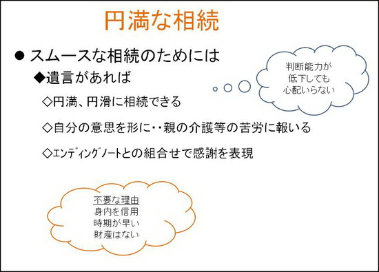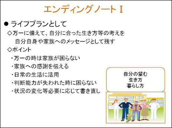 3番目は、エンディングノートについてでした。これは、万一に備えて、自分の考え方をメッセージとして残しておくものだそうです。遺言と違って、自分の日常の生活に活用でき、判断能力が失われたときにも困らない、状況の変化により書き直しもできるとのことです。内容としては、自分と家族の歴史、病気と看護・介護の希望、相続・遺言の方法などを記しておくと良いようです。