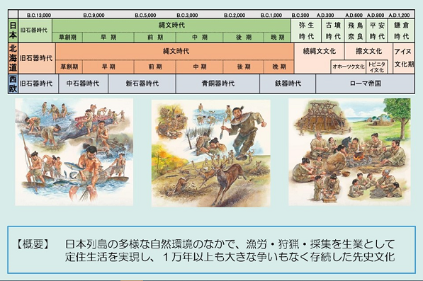 日本列島の多様な自然環境のなかで、漁労・狩猟・採集を生業として定住生活を実現し、1万年以上(おおよそ15,000年前~2,300年前)も大きな争いもなく存続した先史文化。