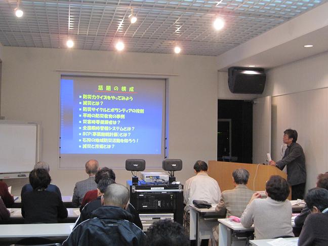 12月18日(土)まちの先生企画講座2 「減災とくらし~いま、あなたとあなたのまちがあぶない!」の第3回「いま、あなたが危ない~急速に進む少子・高齢化と地域防災力とは~」が石狩市民図書館視聴覚室で行われました。講師は、まちの先生・松井義孝さん、受講者は24名でした。