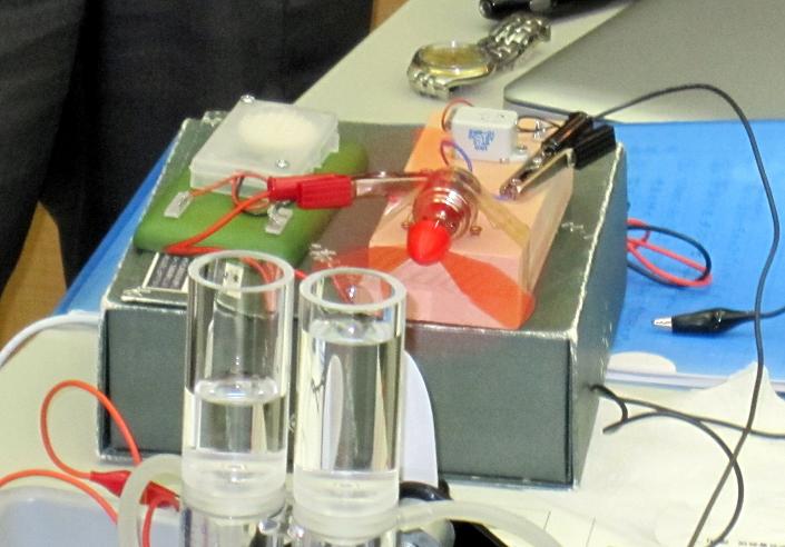実験は「水の電気分解」の逆反応ということで、昔学校で習った「電気分解」の実験に良く似ていました。