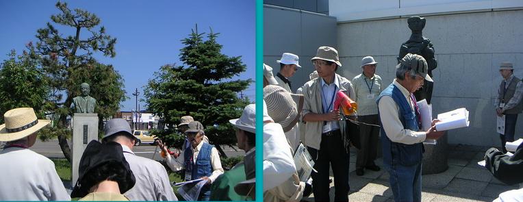 最初に見学したのはいつも見慣れている石狩市役所前でした。公民館から歩いて市役所の正面玄関前へ。右手にいつも見慣れている胸像があります。「飯尾圓什之像」です。氏は明治28年に石狩町に生まれた方で、砂地には無理とされていた10線浜辺りに水田を作り、戦後穀倉地帯としたとのこと。また、町議・町長として活躍された方とのことです。