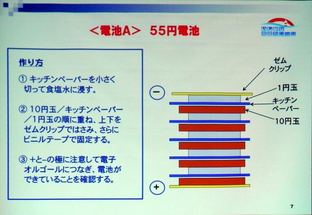 さて、本日の講座ですが、最初に電気、電流、電池についての説明と各実験についての解説があり、そのあと3つの電池(55円電池、人間電池、燃料電池)の実験を行いました。また、徳田さんは、モノクロ・コピーの資料では見にくい部分については、わざわざさらにカラープリントした資料を添付されていて、大変見やすくなっていました。