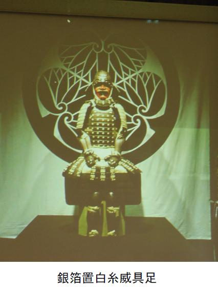 ◆銀箔置白糸威具足(ぎんぱくおきしろいとおどしぐそく)~尚武のコーナーで最初に来場者を迎えるのがこの具足であり、家康の四男・松平忠吉が用いたものである。鎧兜(甲冑)や頬当、脛当などで全身を覆われている。小札(こざね)という、鉄板を白糸で威した形式が用いられているため柔軟な動きができるようになっている。重さは一般的には15~16kgほどでかつての大鎧に比べれば軽い。小札には銀箔が被せられ、当時は銀箔と白糸が美しく映えて輝いていたのであろう。具足は実用面もさることながら、武将の威力や権力、格式を誇示する効果もあった。