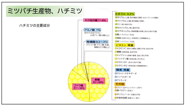 ・それぞれの成分について説明があったが、具体的には以下のハチミツの作用で説明された。