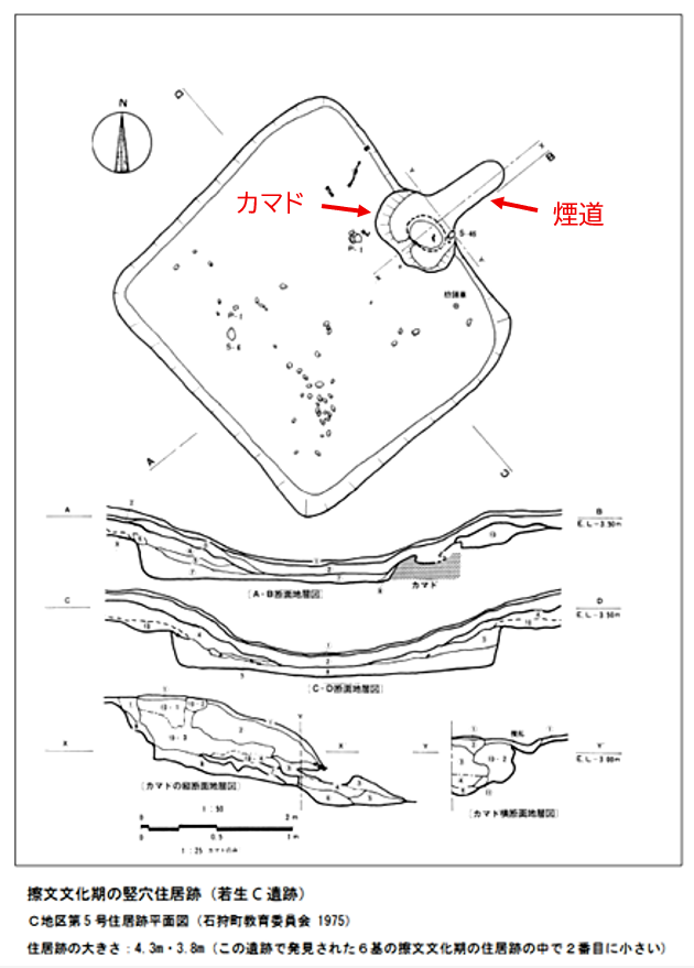・そのうち、第3号、4号竪穴住居跡は縄文文化中期に、第1号、2号竪穴住居跡は擦文文化に属す。擦文文化の竪穴住居跡は完全な形では残っていなかったが、カマドと煙道がある。