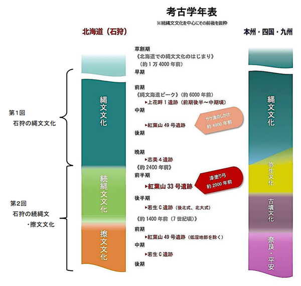 ・紅葉山33号遺跡の遺物は、その特徴から続縄文文化前半期という事が分かるが、放射性炭素年代測定という理化学的方法からも漆塗り弓の年代測定が約2000年前であることが確かめられている(『国立歴史民俗博物館研究報告』(2021)に報告がある)。